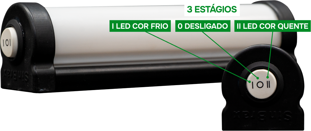 • Temperaturas de Cor: Branco Frio (6500K) e Branco Quente (3000K).